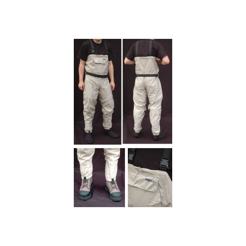 BISON BREATHABLE STOCKING FOOT WADER Colour: stone Articulated knee reinforcement * H style detachable suspender with quick release buckle(socket accepts plug at oblique angles) * Multi-function exterior pockets are ideal for carrying lines & flies * Front chest hand warmer pocket, interior Velcro pocket * Build-in gravel guard with brass hook * 3.5mm neoprene stocking foot with high-density neoprene sole * High front and back with draw cord tighten around chest * Fully taped seams * Lightweight, breathable fabric keeps you dry and comfortable. Available in Medium, Large, Ex Large, and Ex Ex Large. Breathable waders have totally changed life for fisherman. However hot the weather, you should wade and walk in total comfort. Even in the cold months you can still use them over a set of base-layer thermal. In the past, reliability and efficiency in breathables has come at a big price. Not now. These are real quality breathables at a fantastic price. The fabric is waterproof to a hydrostatic pressure of 10,000mm/H2O and breathable to 4,000 g/m²/24hr. In normal speak, this means that you can deep-wade with complete security and you can walk miles in a heat wave! The four-layer construction gives extreme ruggedness with hardly any weight. The design is equally impressive: a removable shoulder strap with low-profile opposing buckles allows rapid conversion to waist-high use. Other features include an internal security pocket, an external gear pocket with a Velcro seal and an external micro-fleece lined hand-warmer pocket for those colder days. A wading belt is supplied as standard Also provided are the built-in, elasticated gravel guards that keep the neoprene foot safe from damage